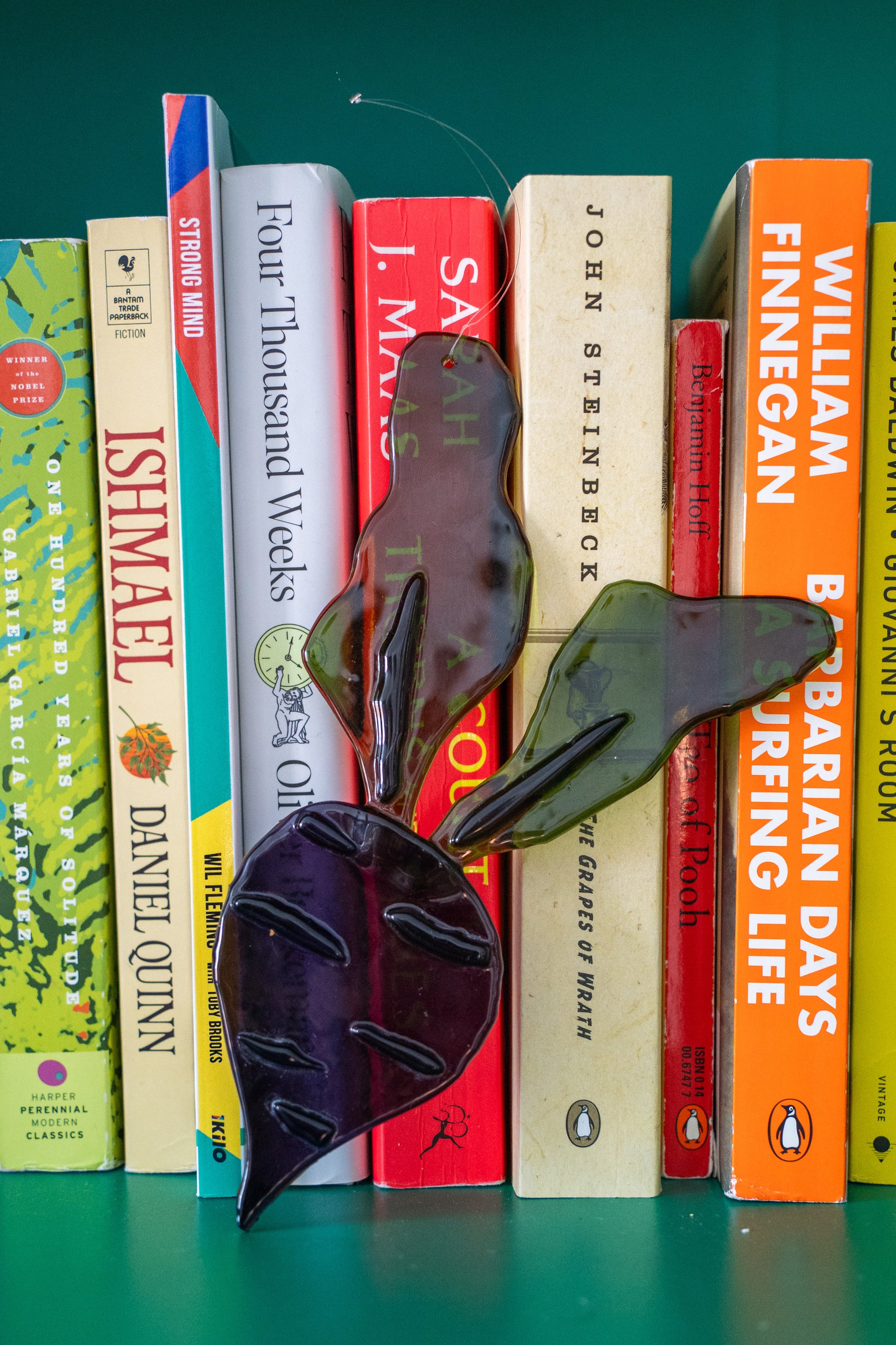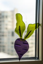 looking for a beet that won't permanently stain everything you own? this handmade fused glass suncatcher is ready to hang in your sunniest window and cast a gorgeous purple glow.
